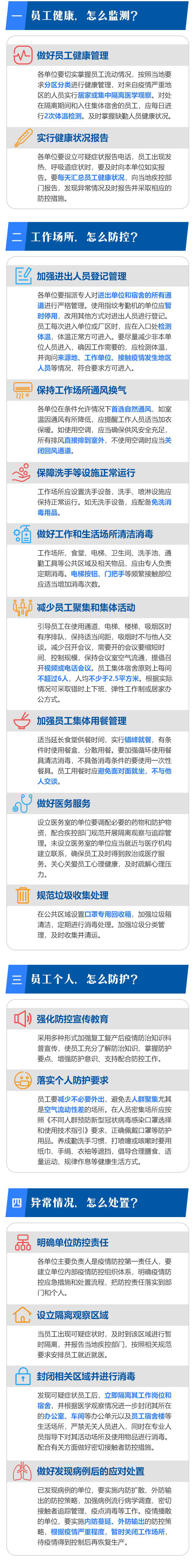 会议主要针对员工进行关于复工复产怎么做防控的专题培训。2月21日,国务院联防联控机制印发的《企事业单位复工复产疫情防控措施指南》对复工复产怎么做防护进行了以下详细说明,我公司将严格按照要求执行。